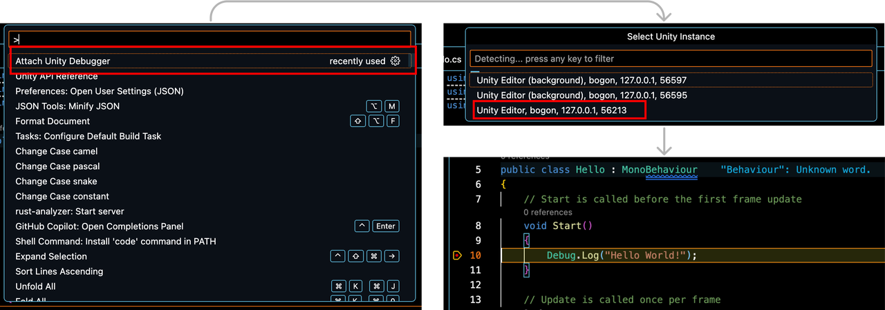 Using breakpoint debugging is also very simple. In Visual Studio Code’s command palette, select Attach Unity Debugger, then select the port number of the foreground Unity Editor, and directly select Play in the Editor to pause the code at the expected location.
