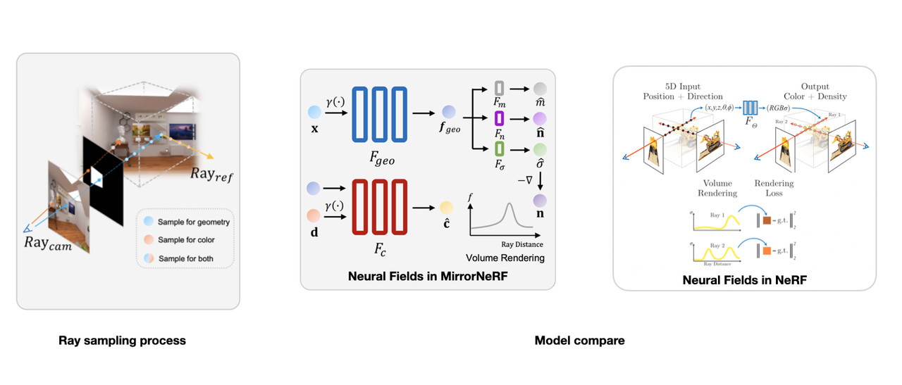 The input to Mirror-NeRF is the spatial position x and view direction d (consistent with traditional NeRF), and the output includes not only the volume density σˆ and radiance ĉ like traditional NeRF, but also the surface normal nˆ. The normal and reflection probability are then used in the Whitted Ray Tracing light transport model to construct a unified neural radiance field, so that the model considers physical reflection during rendering.