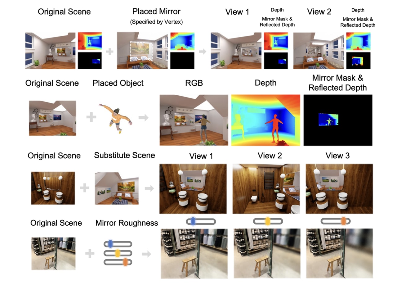Place new objects in the scene, mirrors in the original scene correctly reflect the position of the new objects;