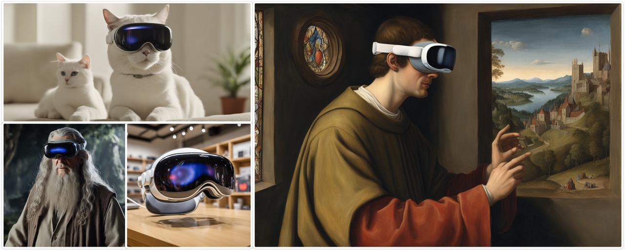 Of course this picture is fake, it is generated using Stable Diffusion XL (SDXL for short) and a model fine-tuned for Apple Vision Pro called sdxl-vision-pro. As you can see, even for a nascent product, it can already render very realistic rendered images in sdxl-vision-pro. For example, a cat and Gandalf wearing Apple Vision Pro, and Apple Vision Pro placed on an indoor table, and even characters in art paintings wearing Apple Vision Pro.