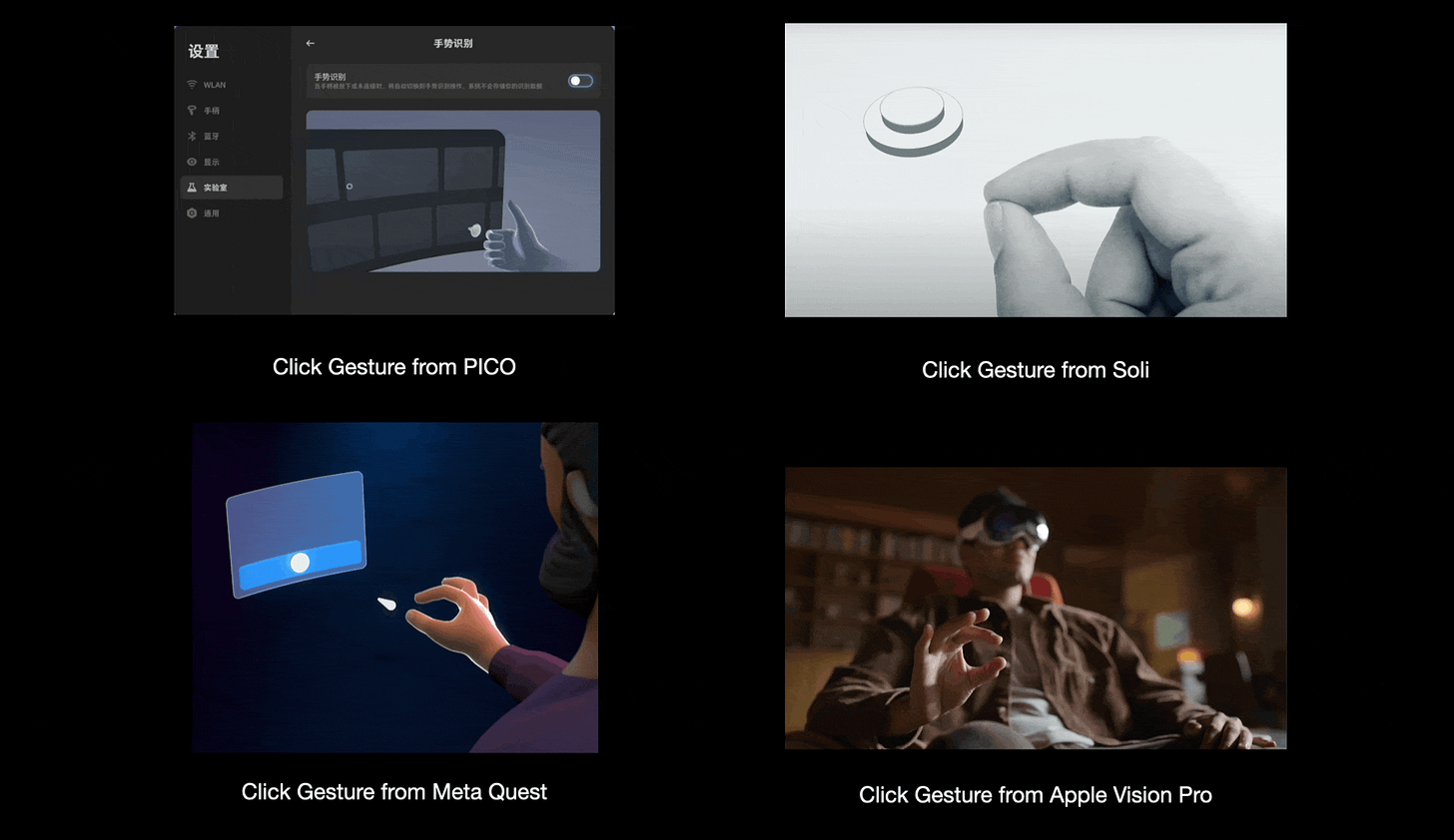 Of course, in addition to designing gestures that are easier to recognize from algorithms, or designing gestures that are more intuitive from human beings, we also need to design gestures from cultural differences. For example, now we are in Meta, Apple Vision Pro and the above-mentioned Soli project. The confirmation button is implemented by pinching the thumb and index finger, but considering the cultural differences in some different regions, you can also choose to click the thumb on the index finger to achieve it, similar to PICO.